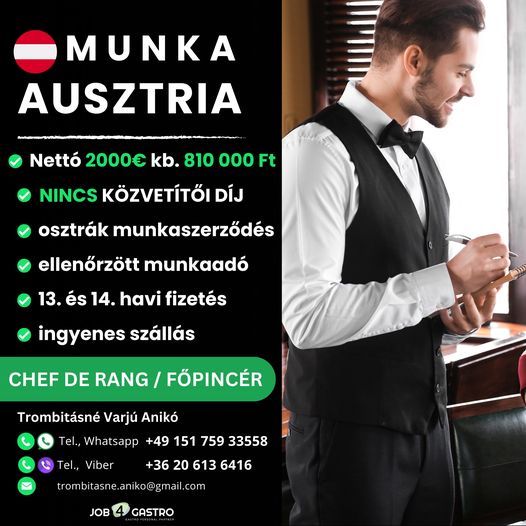 Fiss, Ausztria Fizetés: nettó: 2000 EUR, kb. 815 000 FtKezdés: 2024. december 10.-énA munkaidő napi 8,5 óra osztott műszakban, heti 6 napIngyenes étkezés és szállás a hét 7 napján!Egyágyas szoba saját zuhanyzóval, WC-vel, Wi-Fi-vel és TV-vel.Megbízható leigazolt tulajdonosMinőségi 4 szálloda nagyon jó értékelésekkel, sípálya mellett, jó...