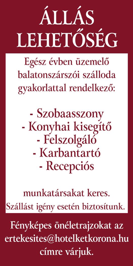 Kedves Álláskeresők!Balatonszárszói szállodánk csapatának bővítése miattSZOBAASSZONYKONYHAI KISEGÍTŐFELSZOLGÁLÓKARBANTARTÓRECEPCIÓSkollégánkat keressük.Jelentkezés:Fényképpel ellátott önéletrajzodat a ertekesites@hotelketkorona.hu e-mail címre várjuk.Jelentkezz még ma, legyél a csapatunk tagja!