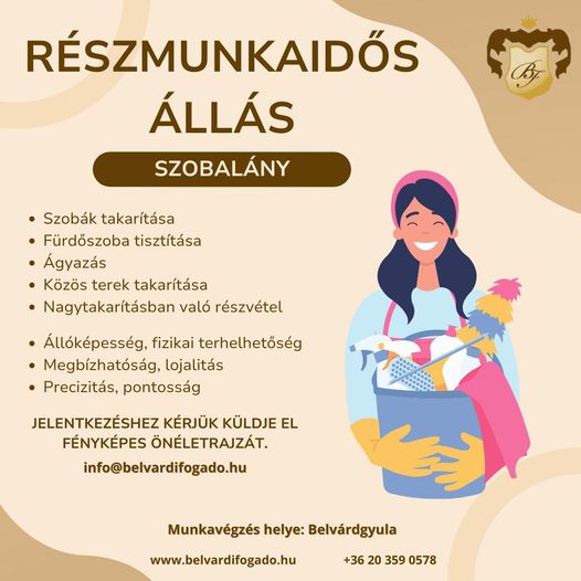 Csapatunk bővítésének céljából keressük családias hangulatú Fogadónkba szobalány pozícióba új munkatársunkat. Ha szeretsz tiszta és rendezett környezetet teremteni, valamint precíz és megbízható vagy, nálunk a helyed! 🌟